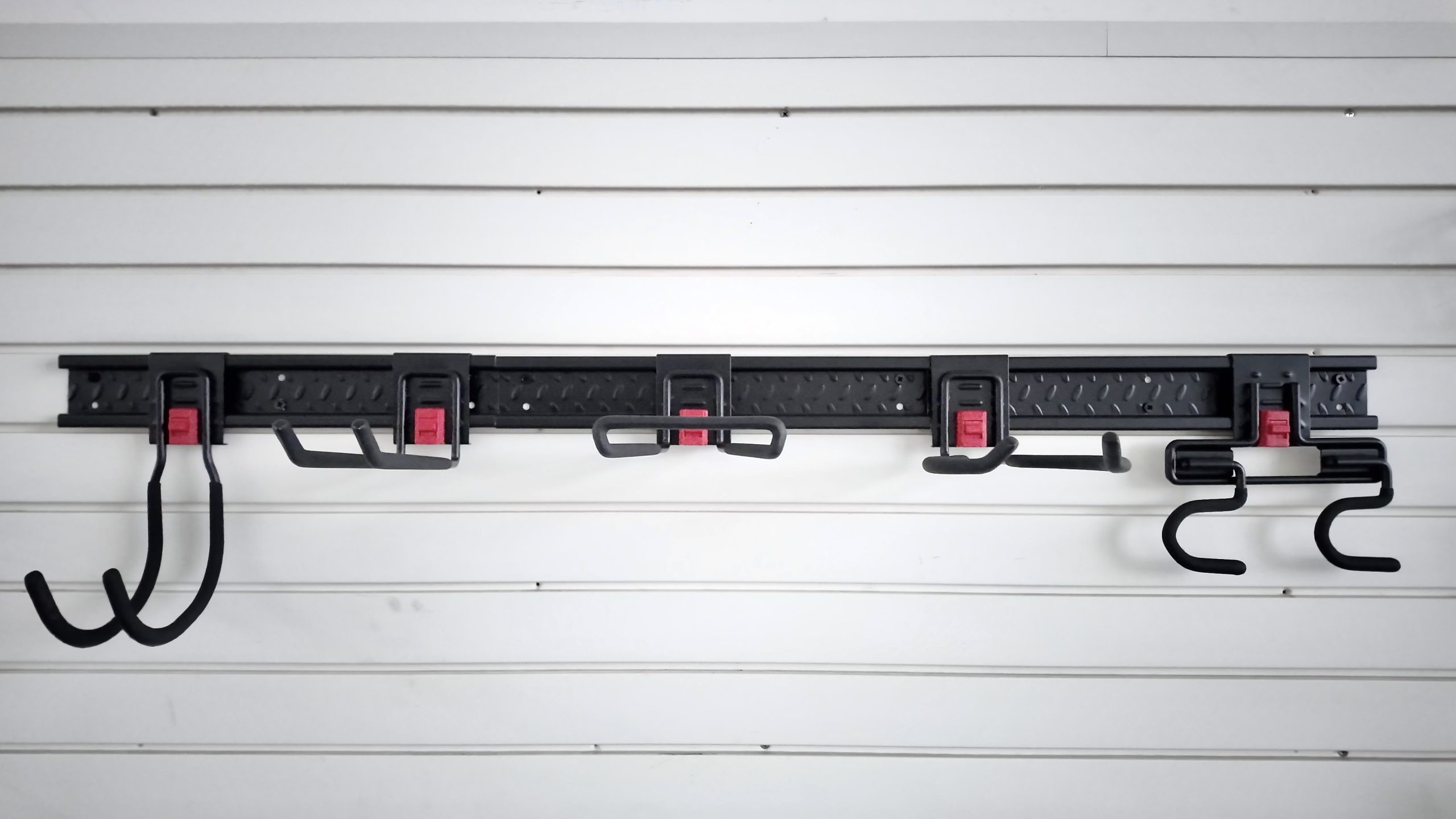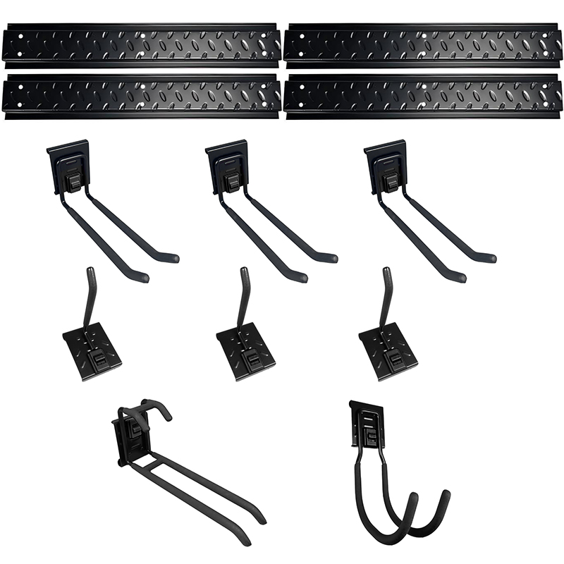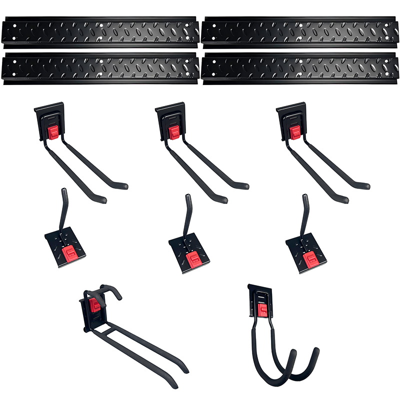 1.Multi functional hook combination for storing gardening tools on garden walls
